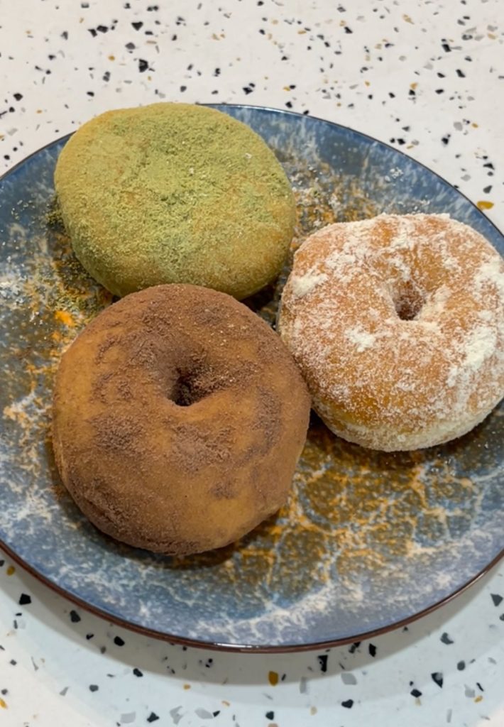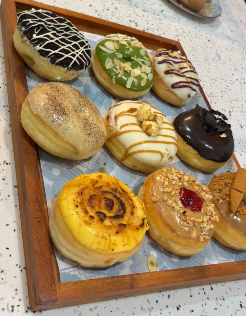 Setiap pagi, aroma donat baru memenuhi toko. Teksturnya lembut, topping-nya meleleh, dan pilihan rasanya variatif — dari glaze klasik, cokelat, keju, hingga gula halus tradisional.