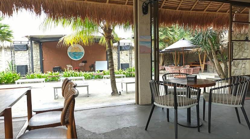 Konsep outdoor-nya unik lantai pasir putih, bean bag warna-warni, dan lampu gantung yang menciptakan suasana seperti di Bali.
