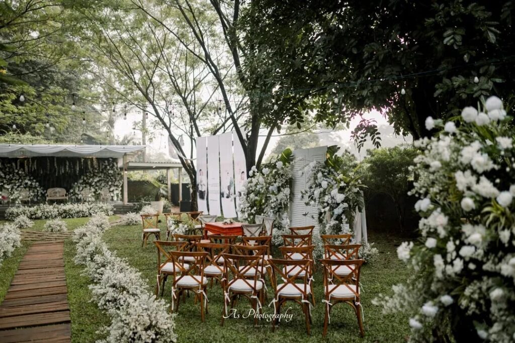 Untuk intimate wedding, tempat ini cocok bagi pasangan yang ingin nuansa garden party yang santai namun tetap elegan. Area outdoor-nya memungkinkan penataan meja panjang atau kursi mengelilingi altar sederhana. Saat sore menjelang, suasana berubah hangat dengan lampu-lampu kecil yang menyala perlahan.