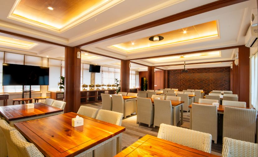 Interior restoran dirancang cukup luas dan cocok untuk keluarga besar. Banyak pengunjung memilih duduk di area outdoor untuk menikmati pemandangan.